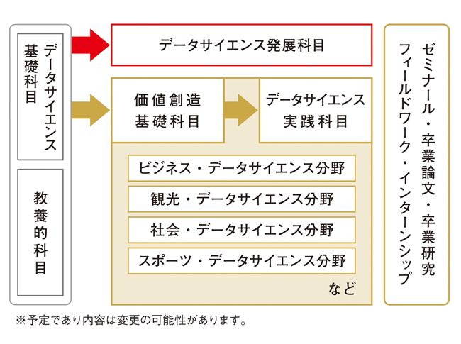 専門科目は数学、プログラミング、アルゴリズム、インターネットの仕組みなどを学ぶ「データサイエンス基礎科目」と「データサイエンス発展科目」で、後者は《ビジネス》《観光》《社会》《スポーツ》をはじめとした様々な分野(写真)を対象とした「価値創造基礎科目」と「データサイエンス実践科目」からなります[図1]。情報学を究めることももちろんできますが、データサイエンスの専門家を目指すわけではないという学生には、自分の興味のあるテーマ、目指す進路、解決したい課題にあわせて、データサイエンスを活用して、「価値創造」にチャレンジしてもらいます。