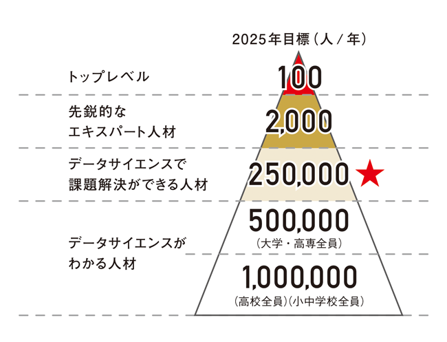 もちろんデータサイエンスは社会のすべての分野とかかわりますから、卒業後の進路はあらゆる分野、職種が対象となります。目指すのは、現場に近い、現場で役立つ、それぞれの職場で必要なプログラム、オンライン環境をサポートできる、まさに《現場で活躍するデータサイエンティスト》。図2でいえば★印の、「データサイエンス課題解決ができる人材」に位置付けられる、今後最も不足すると考えられる層です。